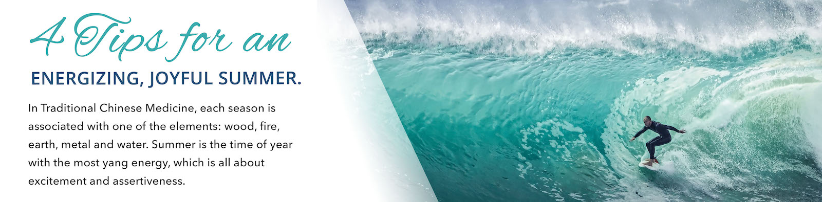 In Traditional Chinese Medicine, each season is associated with one of the elements: wood, fire, earth, metal and water. Perhaps unsurprisingly, summertime is associated with the element fire. Fire represents maximum activity. In nature, everything is at its peak growth during the summer, so TCM sees our energy as its most active and exuberant. Summer is the time of year with the most yang energy, which is all about excitement and assertiveness.